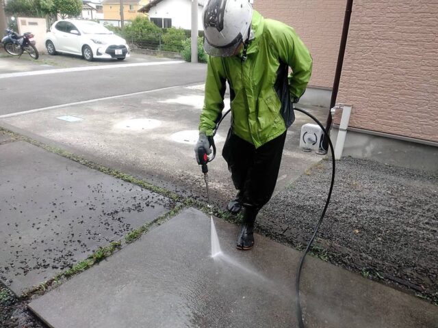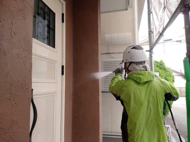 焼津市の外壁塗装専門の岩田塗装店です。足場の組み立てが完了しましたら、いよいよ塗装工事が開始となります。高圧洗浄で表面の汚れを落とし、付帯部の塗装工事を行います。