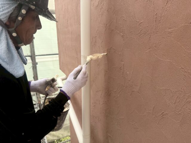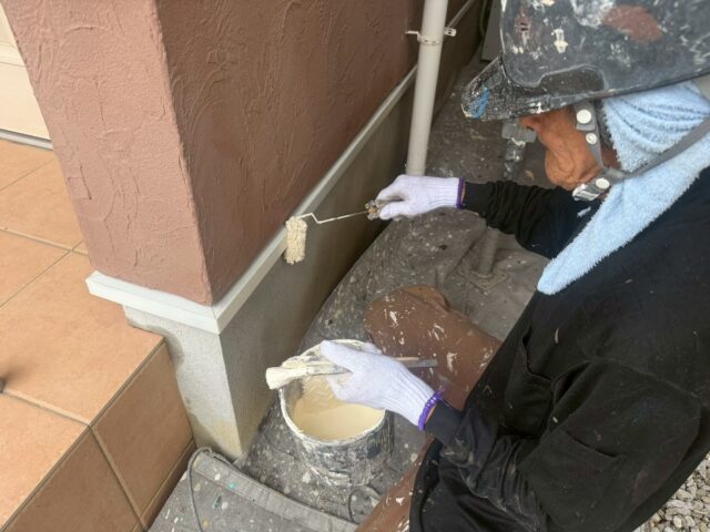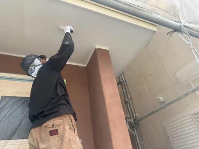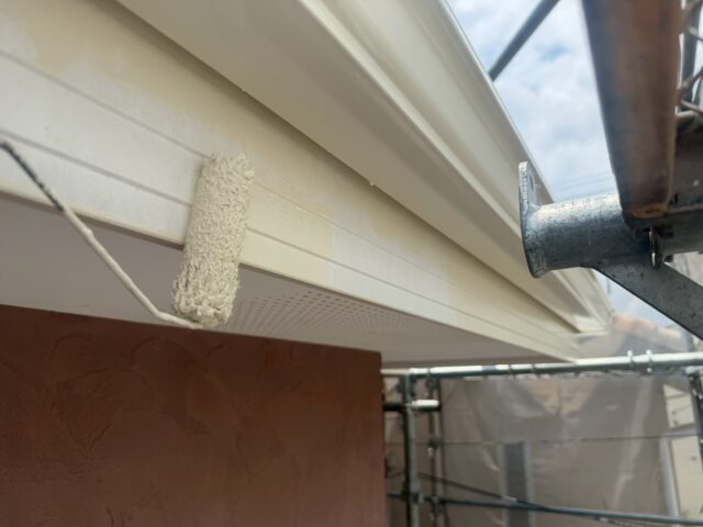 外壁を塗装する前に、雨どい、軒天、水切りなどの鉄部などを中塗りまで塗装をしておきます。細かい作業ですが、丁寧に塗装を行い、完了しましたらいよいよ外壁塗装が始まります。今回は色が大きく変わるので楽しみですね(^^)