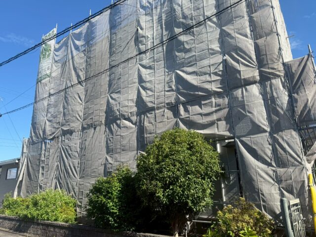 高さがあるので足場工事も慎重に作業をしています。いつもよりも多くの足場職人で作業をして、一日で作業完了!いよいよ工事の開始です。