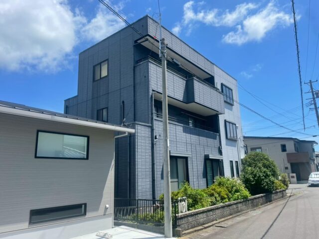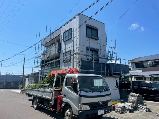 焼津市の外壁塗装専門の岩田塗装店です。以前からお世話になっているお客様からのご依頼で、防水工事と外壁塗装工事をさせていただきました。お家の方は三階建てと大きくご近所も近いので細心の注意を払い、安全第一で作業をしていきます!