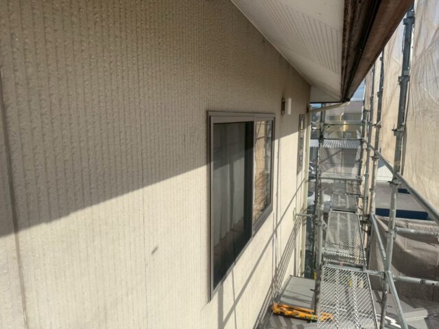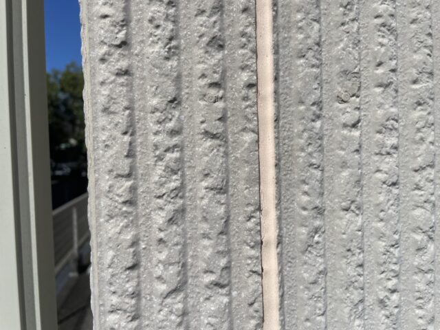 サイディングは全体的な経年による劣化が見られ、北面はコケの付着が目立ちました。それに加え、サイディングのお家で最も大事と言っても過言ではないコーキングの劣化が目立ちました。そのため、耐久性の高いコーキングを使い目地の打ち替えをし、上塗りで使用する塗料は高耐久の無機塗料を使用して塗装させてもらう事となりました。