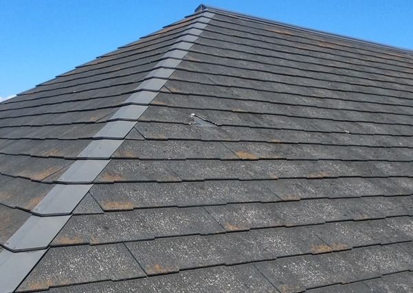 問題なのがこちらの『カラーベスト』です。この屋根はすごく脆弱な屋根で、所々に割れも見られます。この状態の屋根は塗装をする事は出来ず、(厳密には塗装はできますが、数年でカラーベスト自体が劣化します)カバー工法をおすすめします。