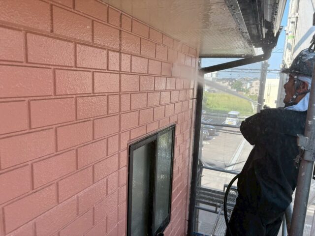 塗装工事の際には、高圧洗浄で表面の汚れを落としてから塗装作業に入るのが一般的です。私たちが使用する高圧洗浄は、家庭用の洗浄機よりも水圧が高く、汚れが良く落ちる反面、飛散も多くなるので、近隣への配慮を欠かさずに作業を行います。