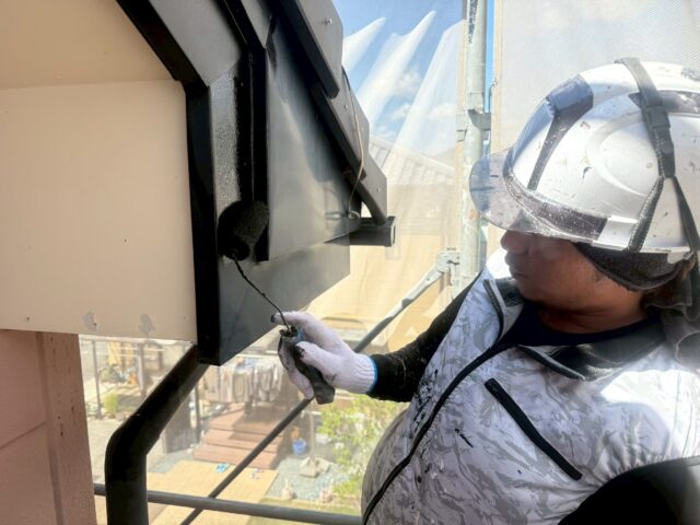 高圧洗浄が完了したら、付帯部の錆止め作業に入ります。トタン部分などに錆止めの塗料を塗装します。さび止めを防止する役割の他に、上塗り塗料がしっかりと塗装でき、仕上がりがキレイになります。