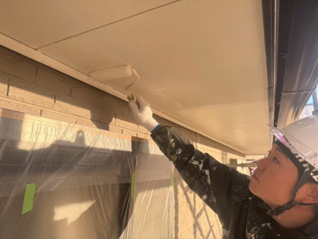 軒天(てんじょう)の塗装も壁の塗装前に仕上げを行います。余談ですが、最近では濃い色で塗装するのが流行りですが、濃い色は汚れが目立つので、白系の色がオススメです。